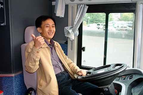 趁着比赛中间休息的几分钟,刘师傅也迫不及待的上车体验一回驾驶神行剑客车的感觉。作为大连交运集团公司的车辆管理员,刘师傅有着十几年的车辆管理经验,说起车型,谈到性能,刘师傅更是滔滔不绝。当记者问到坐在驾驶座上的刘师傅感觉怎么样时,刘师傅用他那灿烂的笑容和竖起的大拇指回答了记者的提问。