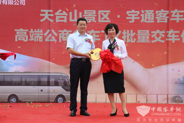 宇通领导向景区客户代表递交象征交车的“金钥匙”