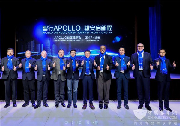 2017年12月20日,百度Apollo第一届理事会在雄安新区顺利召开。河北省委常委、副省长,雄安新区党工委书记、管委会主任陈刚,百度集团总裁兼首席运营官陆奇,以及金龙汽车集团总裁谢思瑜、金龙客车常务副总经理周方明等9家汽车、科技领先企业的高层共同见证了Apollo理事会成立。