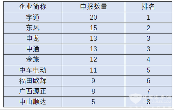 从客车品牌看,宇通客车申报20款客车,位列榜首;东风客车申报15款客车(其中8款客车底盘),位列第二;申龙和中通客车分别申报13款客车,位列第三;金旅客车申报12款产品,位列第四;中车电动申报11客车产品,位列第五; 福田欧辉申报9款客车,位列第六;广西源正、中山顺达分别申报8款、5款,位列第七、第八。另外,北方客车、比亚迪、金龙客车、海格客车、吉利四川、山西原野、珠海银隆等都有多款产品申报。