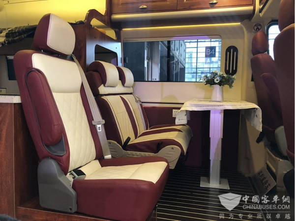 暗红色的饰板和地板配以黑色的皮质座椅,让整个车内的氛围变得高档起来;打开室内全部灯光,给人的感觉像是星级酒店。360°可旋转座椅搭配办公台面,办公可以照常;工作之余吧台来一杯红酒体验美好生活,纵置沙发组合加上对坐沙发,不管是会客还是开个party都绰绰有余。