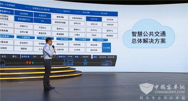 苏院长发布了“智慧城市·交通先行”金龙智慧公共交通整体解决方案,并展示了智慧交通解决方案全景图:围绕着智慧交通的中心大脑、从中心云到边缘云,整体协同约车服务、智能车辆,同步道路的基础设施进行先进的感知,把站台作为智慧化枢纽,同步场站管理,最后通过网络安全平台,以安全有效的运营服务。