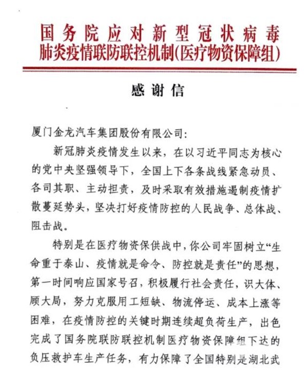 勇立潮头显担当。2020年4月,金龙汽车集团收到了一封来自国务院的感谢信。新冠肺炎疫情来袭时,金龙客车第一时间响应国家号召,出色完成了国务院联防联控机制医疗物资保障组下达的负压救护车生产任务。2021年,在厦门疫情防控关键时刻,金龙客车发挥企业优势,负压救护车、移动CT医疗车等多款产品支援防疫一线。