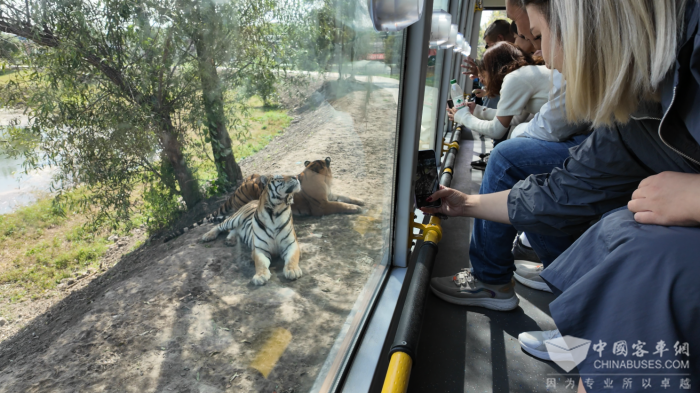 除了视野的升级,这批观光车在座椅布置上也进行了重新设计。不同于常规正面排布的设计,这批观光车采用两边面向的设计理念,方便游客们近距离观赏及投喂东北虎,与老虎进行亲密接触,极大地提升了观赏的趣味性和互动性。