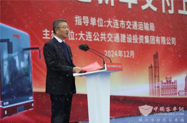 本次交付仪式主题为“新车型 新体验 绿动未来 低碳启航”,大连市交通运输局党组书记、局长赵云峰,大连公共建设投资集团有限公司党委书记、董事长刘军,中国中车集团总裁助理宁文泽,市国资委总会计师李超群,市交通运输局副局长谢新东,国网大连巿沙河口区供电公司党委书记李晓辉,市公安局交警支队副支队长胡其明,中车电动党委副书记、总经理刘凌,大连交通集团副总经理王鹏,大连公交客运集团党委书记、董事长王栋,及各部门相关领导等出席交车仪式,共同见证这一重要时刻。