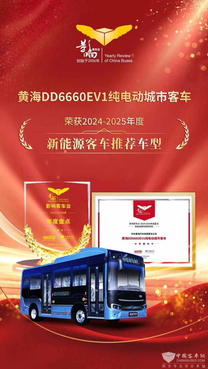 丹东黄海汽车有限责任公司推出的黄海DD6660EV1纯电动城市客车凭借先进的新能源技术与优秀的产品品质,荣获2024-2025年度“新能源客车推荐车型”。