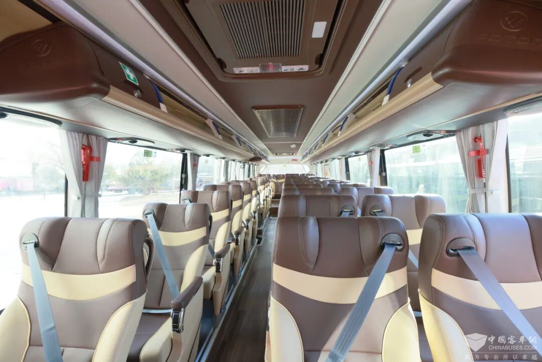 在安全方面,采用全承载车身与4D防护技术,搭载疲劳驾驶预警、360°环视等智能安全配置;采用福田康明斯新一代A系列发动机与德国采埃孚TraXon2AMT自动变速器的黄金组合,确保在高原、山区等复杂路况下的动力性、经济性与操控稳定性,实现全程无忧护航。