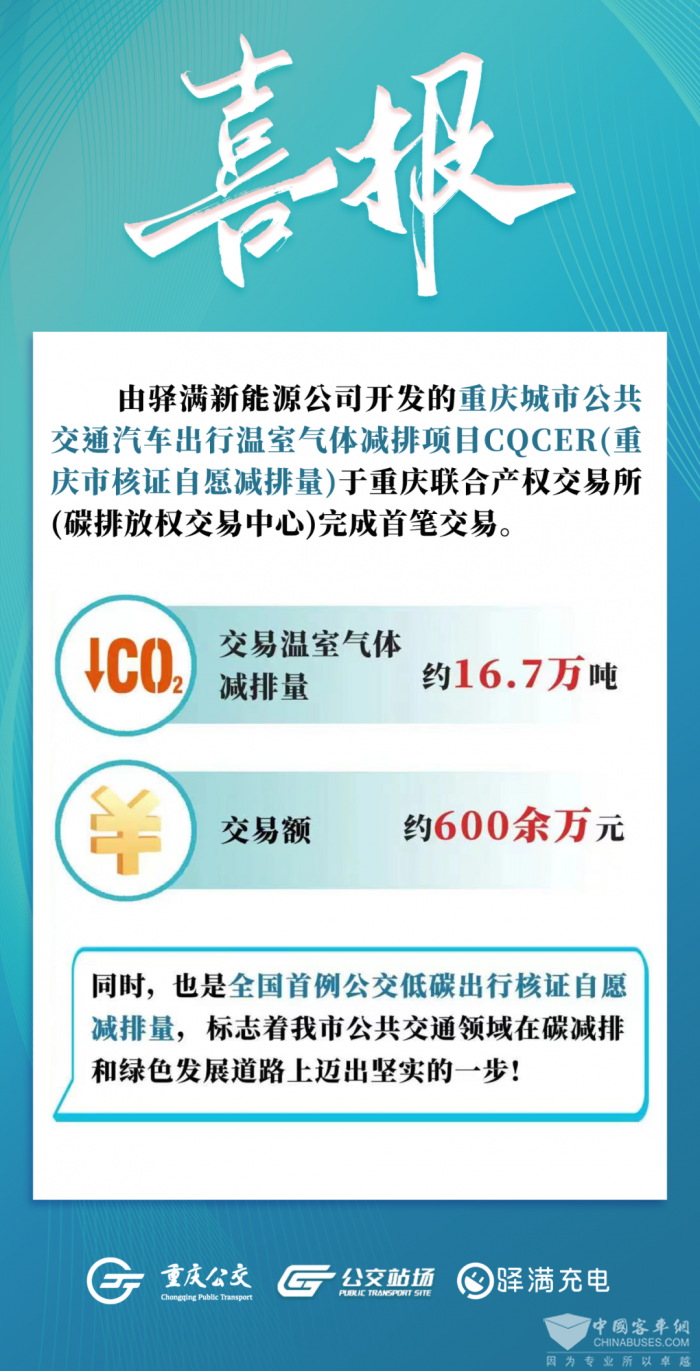 2024年3月8日,由重庆公交集团驿满新能源公司开发的重庆城市公共交通汽车出行温室气体减排项目于重庆联合产权交易所(碳排放权交易中心)完成首笔CQCER(重庆“碳惠通”项目自愿减排量)交易,交易温室气体减排量约16.7万吨,交易额约600余万元,标志着我市公共交通领域在碳减排和绿色发展道路上迈出坚实的一步。