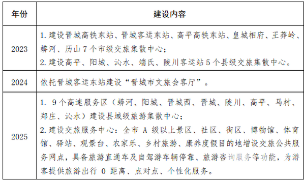 (四)旅游客运提升工程。巩固提高。“五级·一元”公交市域全覆盖,旅游公交实现市区到3A级及以上景区、百村百院以及网红打卡点直通,景区景点之间直通,稳定运营现有的27条旅游公交直通车。新增路线。增加晋城高铁东站、高平高铁东站至陵川王莽岭,客运东站至陵川丈河(凤凰欢乐谷)、高平釜山4条旅游公交专线。打造精品。推出“沁河古堡环线”“示范牧场环线”“炎帝陵-釜山-贾村”“阳城横河-沁水历山-柳氏民居-南阳抗大-太行洪谷”“阳城蟒河-横河-李疙瘩”“浙水-松庙-王莽岭-锡崖沟-七彩太行”“洞头-龙马湖-白马寺”7条精品旅游线路。一票通行。推动车票、门票、住宿一票通。