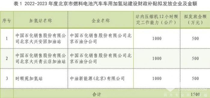 根据公示显示,2022-2023年度北京市燃料电池汽车车用加氢站建设财政补贴拟发放企业为中国石化销售股份有限公司北京石油分公司、中油新能源(北京)有限公司,两家企业共建设站内压缩机12小时额定工作能力为1000公斤的加氢站3坐,补贴金额共1500万元。