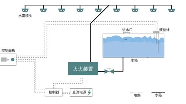 系统工作原理:由手动控制开关、主机、管路喷头等部分组成。由驾驶员根据火情手动启动位于车厢的灭火系统泵组,泵组将水箱内水基型灭火剂加压,通过管道输送至喷头,喷洒到发生火灾的客舱,对客舱内执行快速灭火、降温、除尘,保护乘客的生命财产安全。