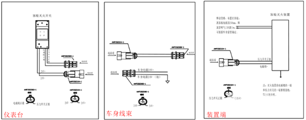 当车厢内发生火情后,驾驶员迅速按下安装在仪表盘附件的手动电启动按钮,客舱灭火系统控制阀开启,喷射灭火剂灭火,灭火剂以全淹没方式覆盖整个保护区。手动控制面板具有故障检测功能,当灭火系统发生线路故障后,控制面板指示灯亮。