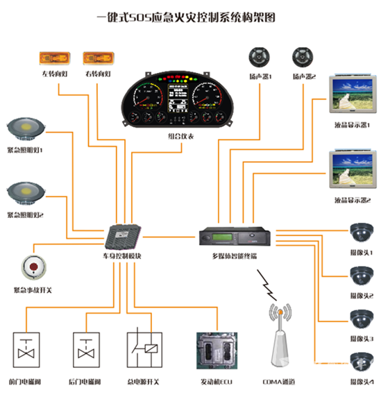系统功能: 当车辆发生紧急事故时,司机只需按一下“SOS紧急事故开关”,打开前后乘客门、打开车辆应急照明灯、打开双闪灯等动作可以在1秒内自动执行完成。如果与GPS系统和3G监控系统连接,自动通知监控中心紧急救援、监控录像自动回传、语音指挥乘客下车逃生等工作都可以由该系统自动控制来完成,不需要司机再操作。可以快速指导紧急救援,大大提高车辆紧急事故处理的速度及效率。