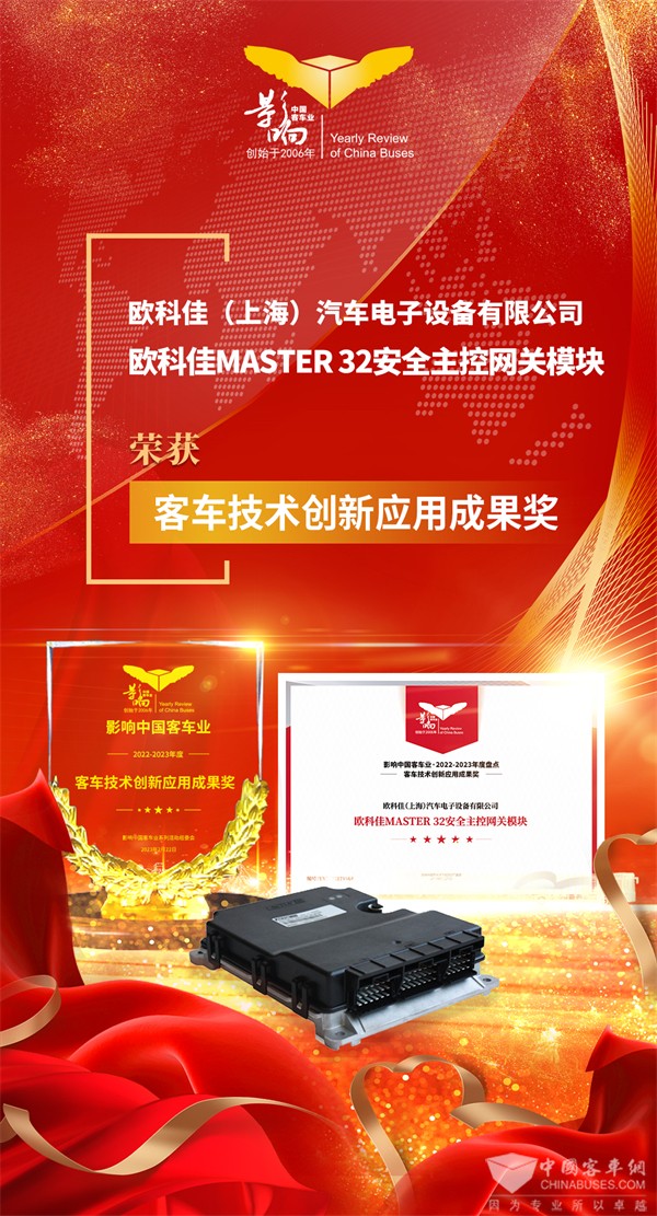 2023 年2月22日,“第17届影响客车业年度盘点活动”在南京举行。活动当晚,欧科佳MASTER 32安全主控网关模块凭借其强大的数据处理、传输能力与高兼容性斩获 “客车技术创新应用成果奖”,彰显了行业对欧科佳研发实力、产品和服务的肯定。