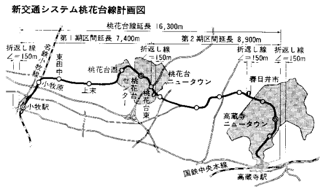 一是爱知县小牧市内的桃花台线,连接小牧市中央的小牧站与东部的桃花台新城,线路全长7.4公里,设站7座,采用胶轮自动导向轨道,于1991年3月25日开通运营,但桃花台新城人口低于规划,而且在2003年名古屋地铁上饭田线开通之前,桃花台线主要通过换乘名古屋铁道小牧线,在上饭田站下车通过公共汽车前往平安通站换乘名古屋地铁,出行非常不便,乘车人数远远低于预期,胶轮导轨AGT系统维护成本高,连年亏损,于2006年10月1日停止运营,2008年1月开始对原线路进行拆除。