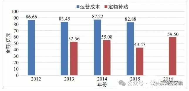 4)专项补贴:对国家燃油补贴、刷卡优惠补贴和场站、新能源公共汽车营运等进行专项补贴。(3)主要成效通过改革,公共汽车企业间的不良竞争有所缓解,不同分区通过引入竞争机制,实现了专营区域间的适度竞争,有利于公共汽车服务水平的提高。线路数从2011 年825 条增至2015 年903 条, 500 m 车站覆盖率从87%提高到近95%,公共汽车服务指数(反映公共汽车运行、拥挤、候车等情况)从2015年80.9 提高至2017 年84.1,企业运营成本从2012 年86.7 亿元下降至2015 年82.9 亿元。区域内新开线路经营权由区域专营招标获取,并直接授予给获得区域经营权的企业,提高了特许经营的组织实施效率。总的来说,深圳市公共汽车改革成效主要体现在三个层面:市民层面,公共汽车服务质量有较大提升;企业层面,一定程度激发了企业内生动力;政府层面,有效控制了成本的增长,补贴规模总体稳定(见图3)。