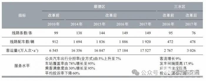 (5)主要成效实施改革后,顺德区、三水区公共汽车线路数及客运量均得到显著提升,公共汽车出行分担率、车站覆盖率以及乘客满意度和投诉率等指标都有不同程度的提升(见表3)。表3 实施改革前后佛山市公共汽车交通服务主要成效