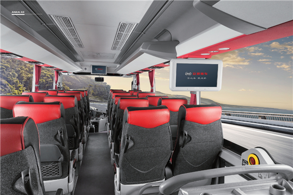 安凯独有发明专利的车载内环境管理系统,在车辆的制冷、制热、新风换气、空气净化等方面具有优异表现,通过自动感应车厢内CO2浓度,自动进行车内外空气循环更换,3-4分钟车厢就能完全换气一次,还能够去除空气颗粒悬浮物,降低PM2.5数值达70%-90%;通过采用新型隔音材料及减振、阻隔、疏散等降噪技术,匀速行驶时车内噪音低至66dBA,真正实现座舱静音;配备双A形臂式独立空气悬挂,降低车身振动频率,有效衰减因路面不平而造成的颠簸,使车辆有着良好的平顺性;搭载的大屏智能终端技术,智能驾驶更安心。