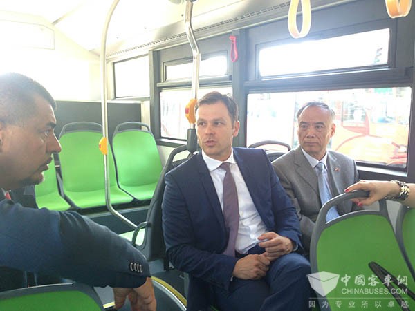 辛尼萨与李满长试乘苏州金龙超级电容车