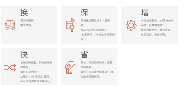 第二,提供"电池、电机和电控三大系统"的十年质保,并提供24小时全天保姆式服务;