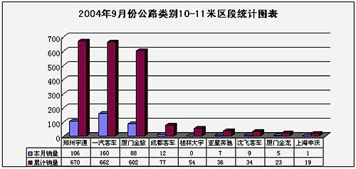 2004年9月份公路类别11-12米区段共销售851辆,累计销售5787辆。其中,厦门金龙以250辆的销量,1509辆的累计销量排名第一。郑州宇通和重庆宇通的销量分别为109辆、111辆。在本统计图表中,郑州宇通和重庆宇通是分别统计,以方便企业细化市场。 2004年9月份公路类别10-11米区段共销售390辆,1-9月份累计销售2180辆。从收入到本统计图表中的企业数量就可以看出本区段的市场竞争十分激烈。郑州宇通以106辆的销量,670辆的累计销量位列榜首。一汽客车与厦门金旅分列二、三位。但他们与郑州宇通的差别不是很明显。本段市场主要为前三名的争夺,厦门金龙的累计销量只有23辆,位列第八。 2004年9月份公路类别9-10区段共销售379辆,1-9月份累计销售1862辆。本区段市场主要集中在丹东黄海和亚星奔驰。他们分别以151、77的本月销量和621、571的1-9月累计销量名列前两名。厦门金旅和厦门金龙分列三、六名。 2004年9月份公路类别8-9米区段共销售724辆,1-9月份累计销售4840辆。郑州宇通以276辆的月销量,1768辆的累计销量位列第一。“三龙”紧随其后。厦门金龙的本月销量为212辆,1-9月累计销量1326辆。厦门金旅的月销量为127辆,1-9月份累计销量815辆。本区段市场集中度很高。 2004年9月份公路类别7-8米区段共销售1372辆,1-9月份累计销售8575辆。本区段郑州宇通以543辆的销量,2806辆的累计销量排名首位。厦门金旅的本月销量为332辆,1-9月累计销量为2279辆。厦门金龙排名第三。市场竞争主要为郑州宇通和厦门金旅的争夺。